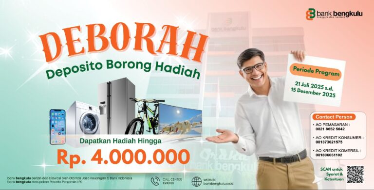Bengkulu – Bank Bengkulu menghadirkan Program Deposito Borong Hadiah (Deborah). Program spesial bagi nasabah setia ini resmi dimulai pada 21 Juli 2025 hingga 15 Desember 2025.